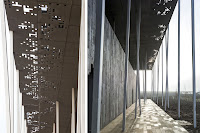 Located between these is the third, by far the smallest and clad in zinc, which provides ticketing and guide facilities. Oversailing them all, and resting on 211 irregularly placed sloping columns, is a steel canopy clad on the underside with zinc metal panels and shaped with a complex geometry reflecting the local landforms. Local, recyclable and renewable materials have been used wherever possible.